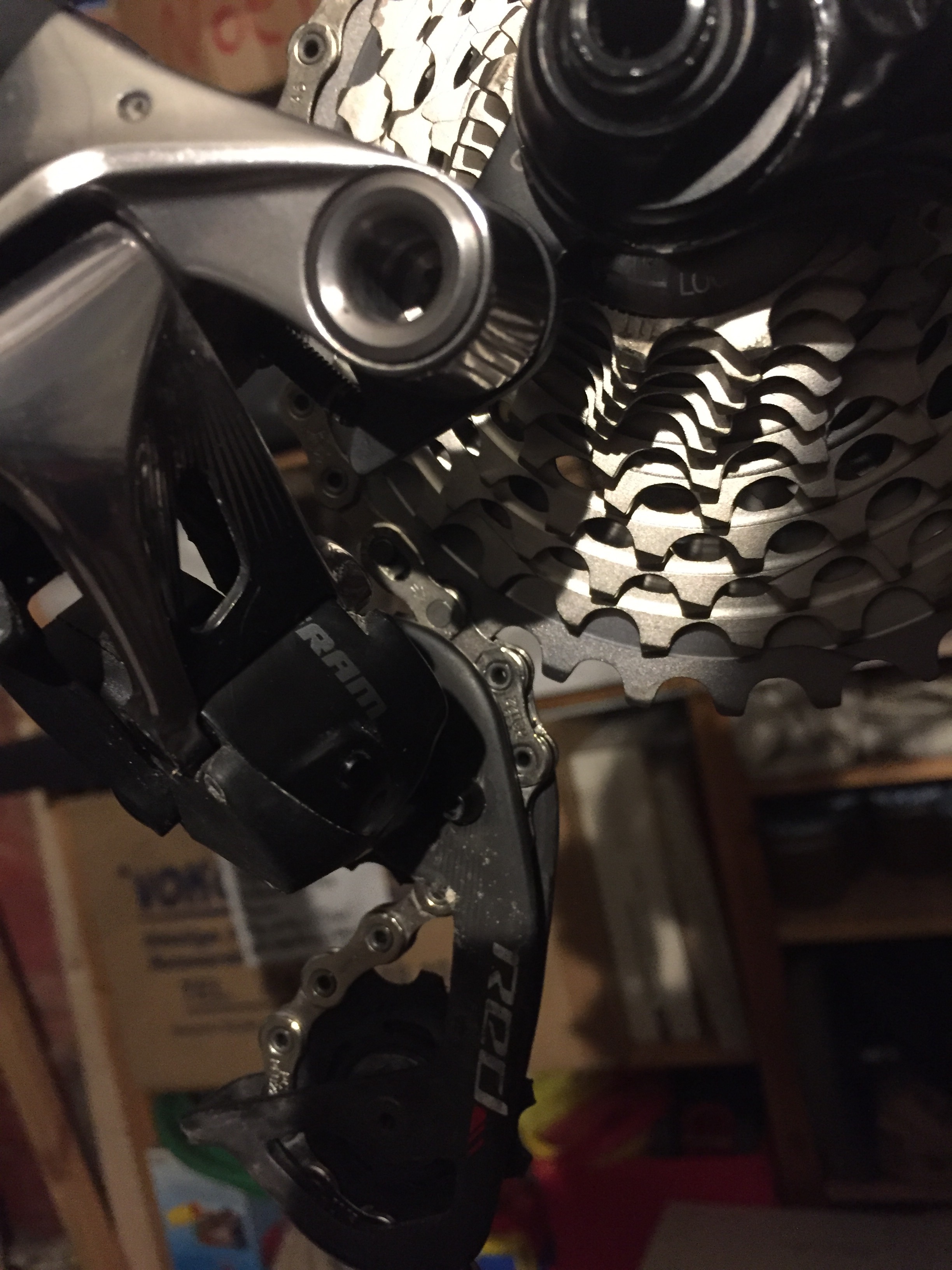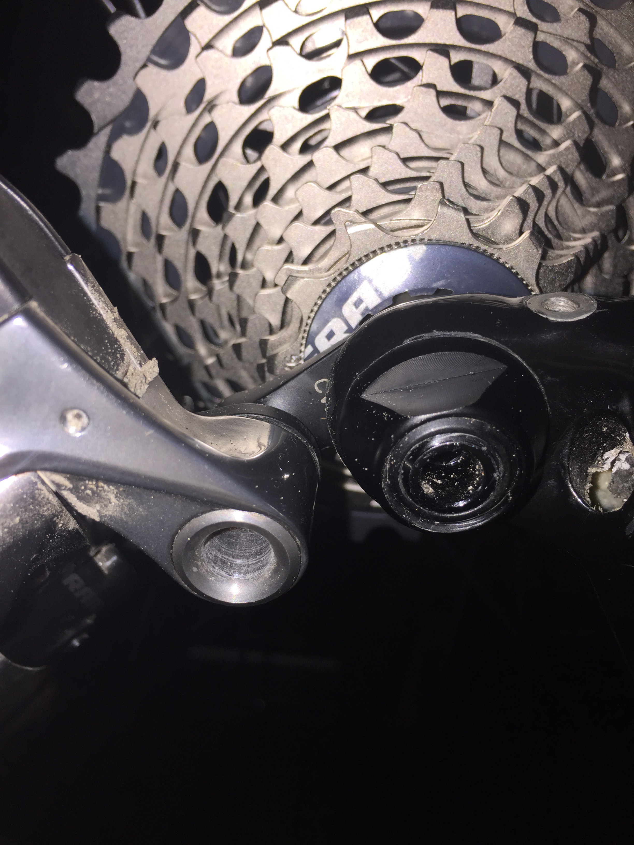 Shifting with SRAM eTap was also quite a risk, as the max. allowed size of the rear cassette was 28 teeth. I tried to install the GOAT LINK, that lowers the position of the rear derailleur but also further out. That means the reach of the derailleur was taken further out so that the 10th and 11th cassette gear could not be reached anymore. So, the GOAT LINK was no option anymore. I took the risk and ordered a cassette with 32 teeth. The required 6mm between derailleur and cassette could not be realised anymore, but it worked.