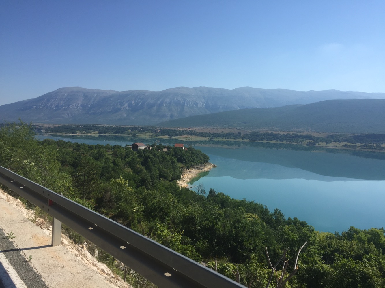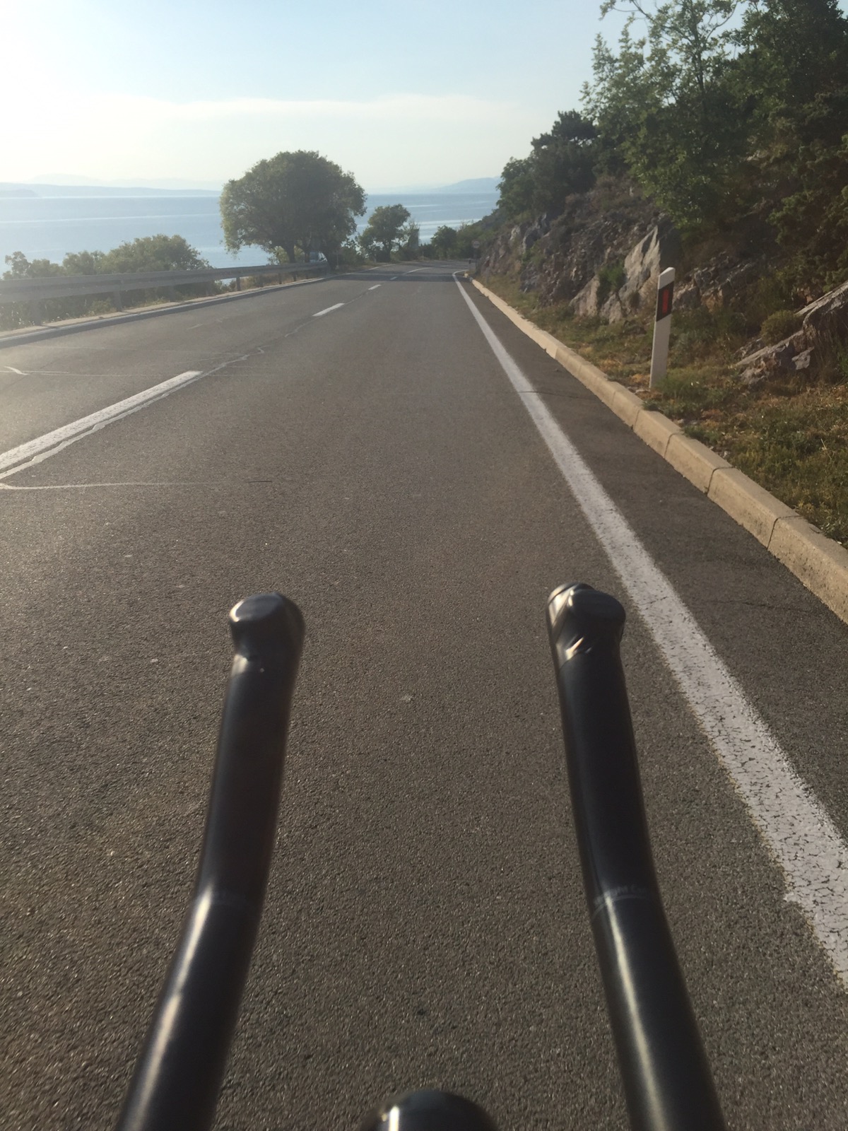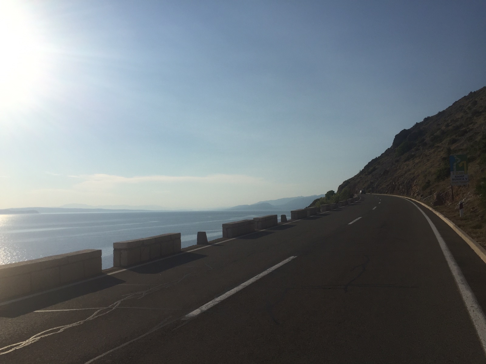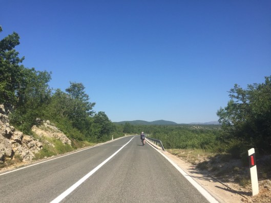 After 12 hours or rest I decided to get up, Zoltan who moved to the bench next to me, also woke up and we packed our stuff together and decided to cycle towards Trily and Sinj together. As I remembered this would be the closest café and supermarket directly opposite of the café, crossing the river Cetina we can find a bakery. I shared some Dolo-Cyl-Oil with Zoltan as he told me that his legs were hurting quite a lot. After the bakery I headed on. Feeling good again, and standing on my personal break a little not to get into trouble on this day, again. From Knin over to Gracac, the last time I rode it this way, I can clearly remember how much I suffered, this time I felt good. I knew the road and what to expect, makes a biiig difference. I carried enough food, had water refilling stops every two hours and I collected tons of water ice cream on that day. The route led me in land, with very very few winds so it got really hot. It was quite some climbing again and I had the feeling that no rider was close to me. After the racing attitude of the day before, I immediately deleted the dot watching option from my phone, so I was free of anything. Back in my traditional mood and feeling good, finally. During the late afternoon a rider appeared in front of me when I planned to get on the back of the mountains that lead towards Rijeka. But he followed the road to descend towards Senj. As I was not following any navigational device, I decided to take the risk, as we were already in the late afternoon and there won’t be big risk of heavy weather from here to Rijeka. Okay, I followed him. After I made my decision he stopped for refuelling his water bottles. It looked as if he wanted to jump into the fountain next to the road. We waved hello and I continued. My decision of changing the route was made, I had not clear picture how to get around at Bakar, but never mind, we would figure out a way, later.